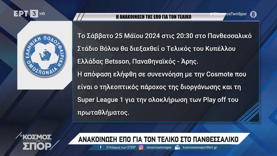 ΠΟΔΟΣΦΑΙΡΟ Επίσημο: Τελικός κυπέλλου Ελλάδος το Σάββατο 25 Μαΐου Last updated: 30/04/2024 21:02 Sportube Team Share SHARE Η ανακοίνωση της ΕΠΟ για τον τελικό του κυπέλλου Ελλάδος στο Πανθεσσαλικό. Μάτζικ Τζόνσον: «Ο Γιόκιτς αλλάζει το μπάσκετ» Μπολόνια-Φιορεντίνα 2-1 Έρευνα από την αστυνομία για τον θάνατο οπαδού της ΑΕΚ Τότεναμ-Λέστερ 6-2 Σεβίλλη – Αθλέτικ Μπιλμπάο 1-1 Share This Article Facebook Whatsapp Whatsapp Email Copy Link
