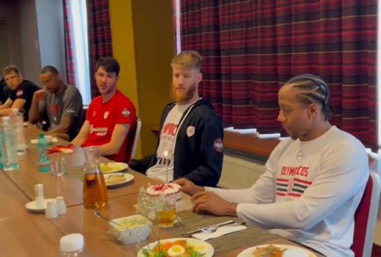Οι παίκτες και το σταφ του Ολυμπιακού έκαναν έκπληξη… γενεθλίων στον Αϊζάια Κάνναν, εμφανίζοντας μια τούρτα γενεθλίων στον Αμερικανό γκαρντ, για τα 32α γενέθλιά του.
